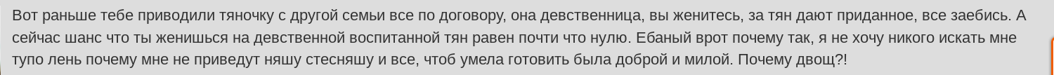 Я знаю почему ты сыч и омежка. Именно в силу этого, твои деды, отцы передали тебе гены не альфача, от которого текут тянки, а посредственности. В те времена таких с посредственностями принуждали продолжать род с помощью: