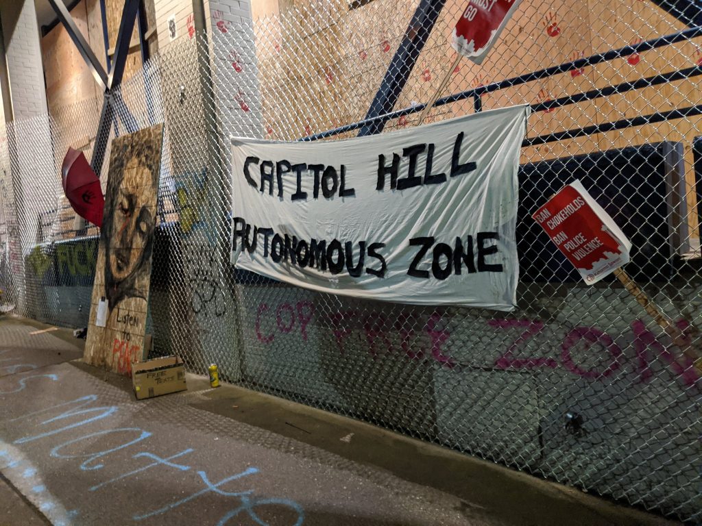 Восточный участок Департамента полиции Сиэтла захвачен протестующими. Кроме того, он заняли шесть городских кварталов, объявленных Автономной зоной Капитолийского холма (CHAZ), объявив эту территорию свободной от полиции, Национальной гвардии и других официальных формирований.