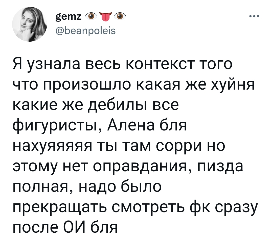 и отморозил his balls , Елизавете Сердюковой присвоили 3 спортивный, так и не дочитал фанфик, Липнягова из Ебурга едва не победила, а выиграла фигуристка с 18 места в КП, only kulikova and samodelkina have some form of personal charm out of all these juniors. zinina too but nothing extraordinary. generally, complete void for the next generation. Малышева докаталась до 188,85, Арина девочка красивая и умная(забанила шизика) , Погребицкая показала судьям крест, но через несколько минут всё-таки начала прокат, Милана Полосухина перформерша, фигуристки употребляли алкоголь, Елизавета Мышкина была в УОР4 на предыдущем Лазуткине и программа та же самая, выезд из дупля у Сильвановской получился продолжением захода, Моисеевская Лебедева отпрыгала контент ОЧ, Пермякова с Волобуевойнаверное , Горнякова с Головкиным, испытывал религиозный экспириенс и выяснял кто такая валькирия, Тренерша Ивановой Жердзицкая могла быть одногрупницей Этерички (1977 г.р., группа Плинера), Щербочок вылетелв прифронтовую зону , Дзепку никто не записал. Москвина неудачно упала, попыталась продолжить, но от боли опять легла на лёд. Её не наказали и после паузы дали докатать. А колода Уэйтса выдаёт в тебе культурного человека.Как быстро время летит. Новый Год, Новый Год, Новый Год. Лазуткин, Лазуткин, Лазуткин.