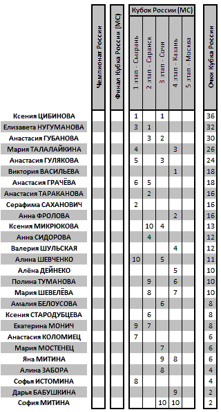 Распределение очков/этапов Гран-При 2019/20 у мастеров: