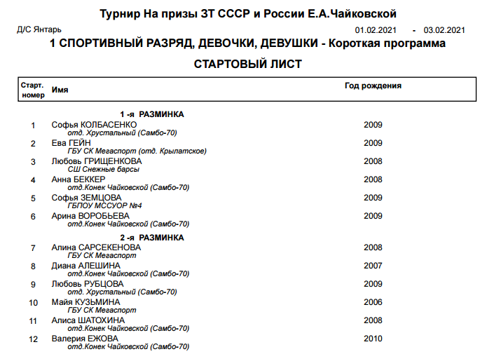 1 - 3 февраля, Всероссийские соревнования по фигурному катанию на коньках «На призы Заслуженного тренера СССР и России Е.А. Чайковской», Москва, ДС «Янтарь»