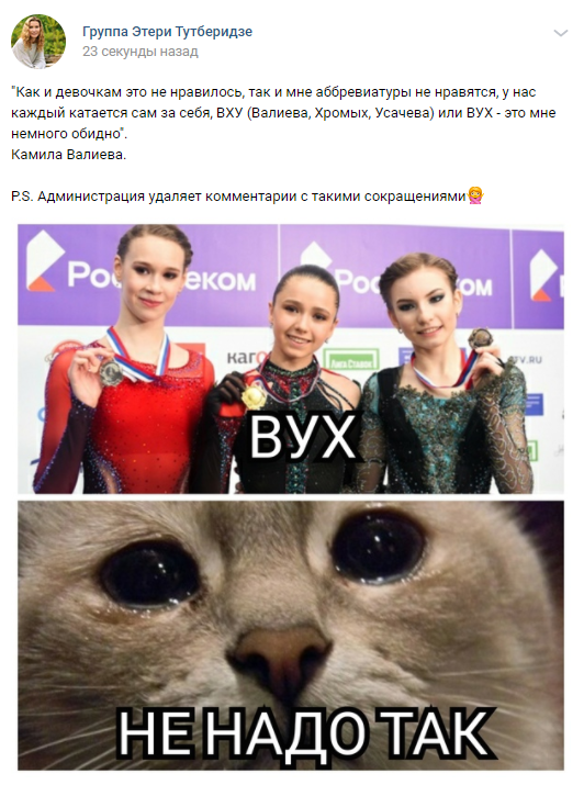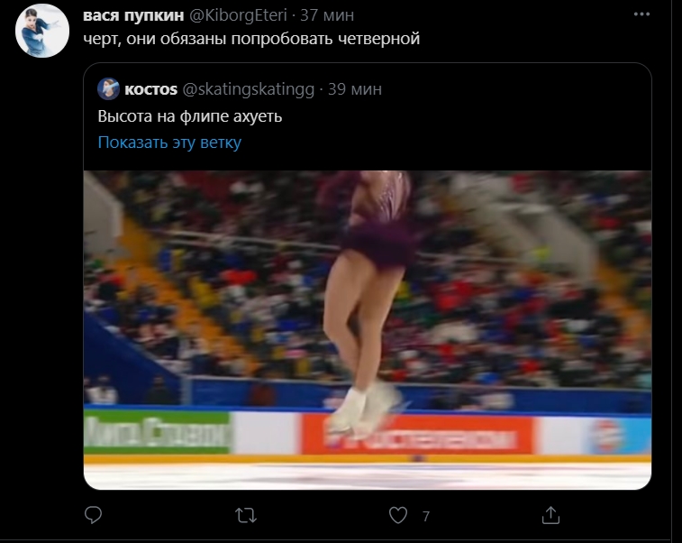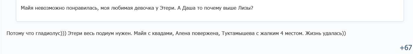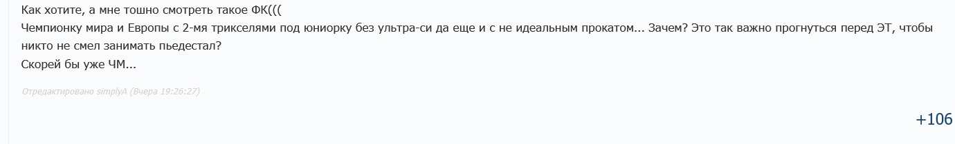 Победителей Кубка тред. В первую очередь чествуем героя дня Хромика, не только новорожденную четверняху, но и внезапно первую мультиквадистку своего поколения. Валли поздравляем с победой и поощряем за стремление расти над собой, но журим за стремление покакоть на льду. Бронзового Усачика отмечаем за стабильность и напутствуем подтягиваться за своими ультрасишными сверстницами. Все трех женщин с успешным завершением сезона, ну а финал Кубка тем временем продолжается уже лолической битвой в этом итт.