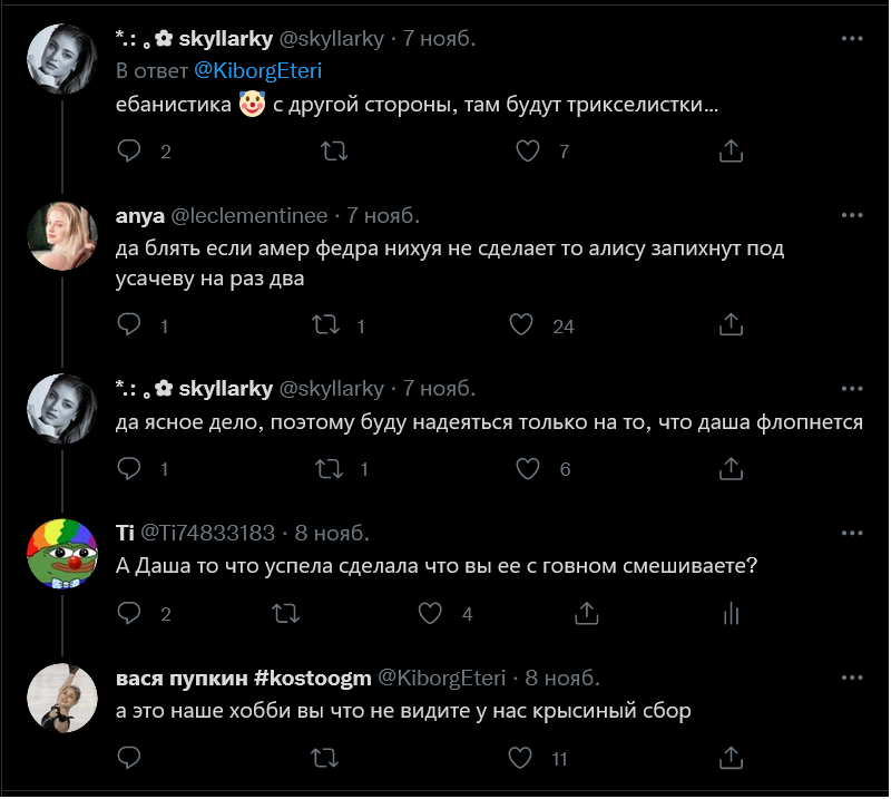 Йогурт, Лукашик, Сарновская, Уткина, Андрейчик, Гордеева, Криви, Мелкумяш, Пряник, Дикая, Чесночок,
