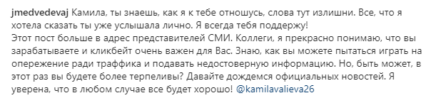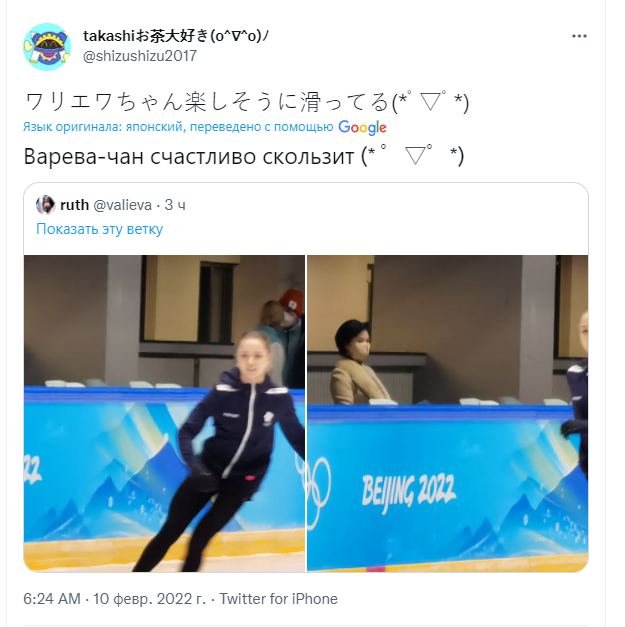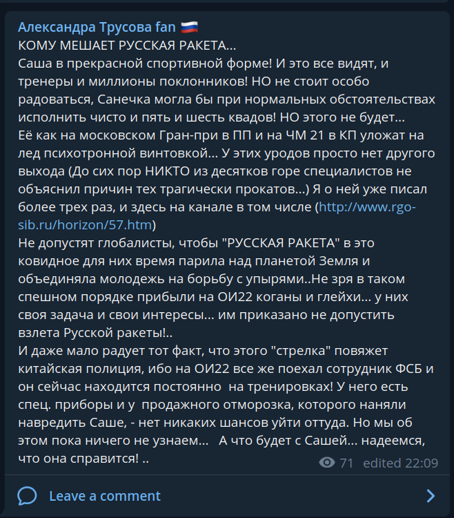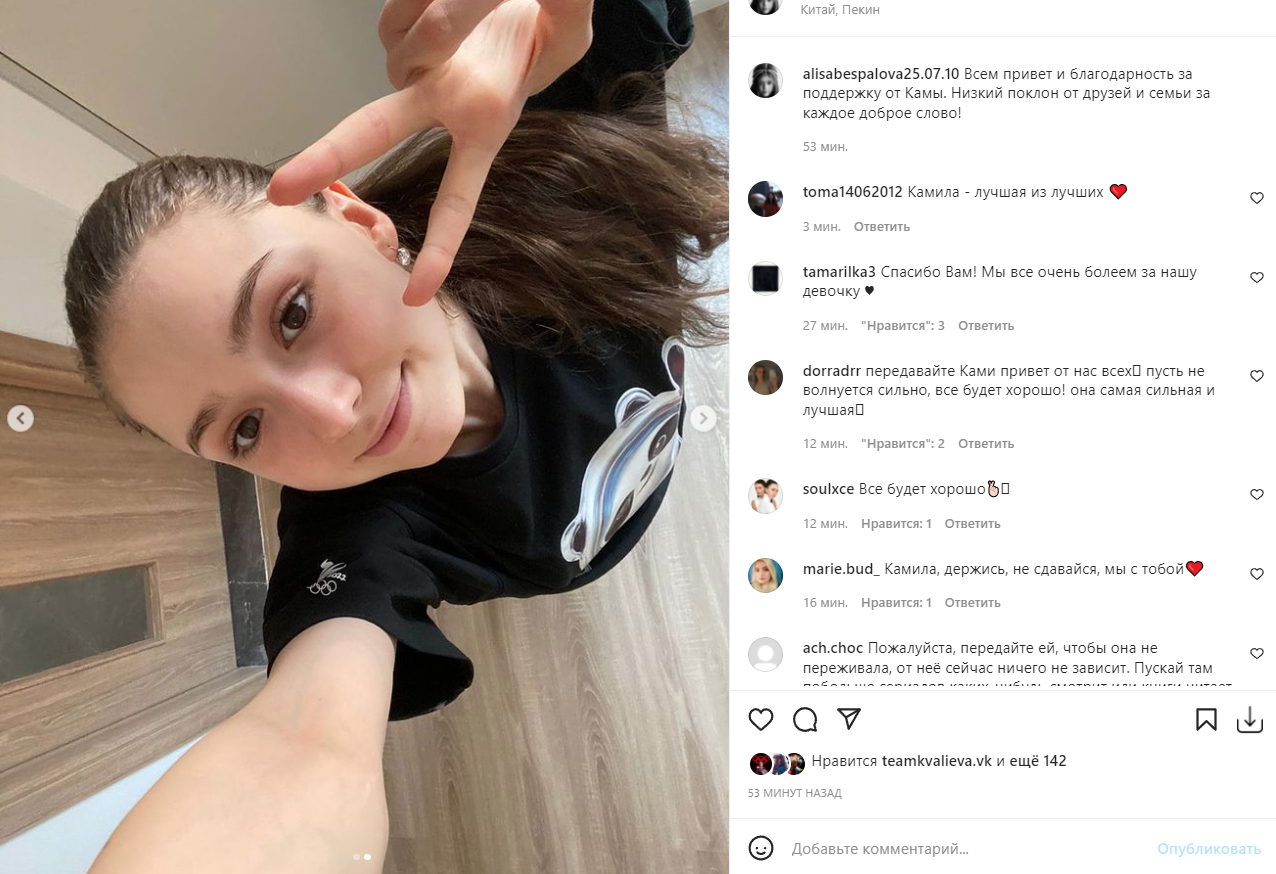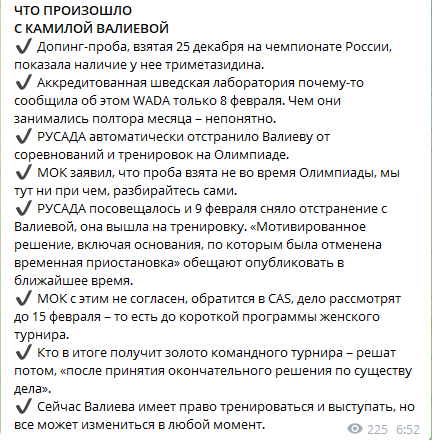 «8 февраля 2022 года после окончания командных соревнований по фигурному катанию на XXIV Олимпийских зимних играх 2022 года Олимпийский комитет России получил информацию от Международного агентства по тестированию (ITA) о том, что Российское антидопинговое агентство (РУСАДА) применило к Cпортсменке временное отстранение, начиная с 8 февраля 2022 года, 11.36 утра (по пекинскому времени).
