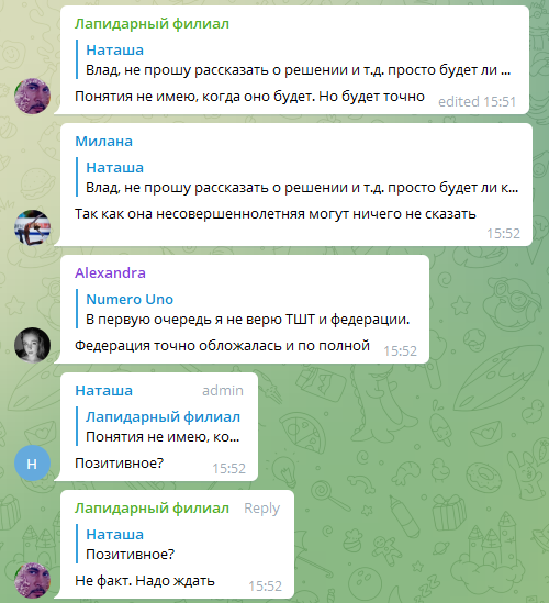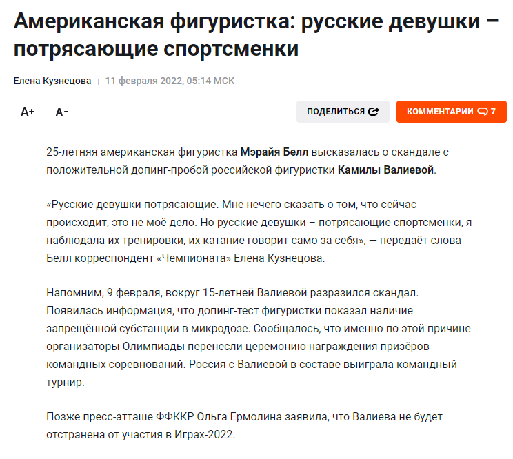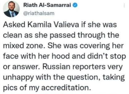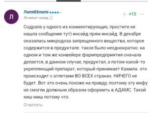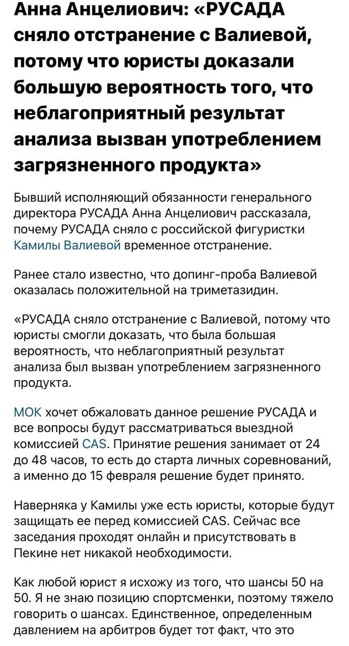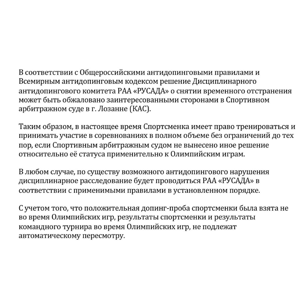 Допинг-проба спортсменки, которая дала положительный результат, не относится к периоду проведения Олимпийских игр. При этом Спортсменка до и после 25 декабря 2021 года неоднократно сдавала допинг-тесты, в том числе уже в Пекине в ходе турнира по фигурному катанию. Все результаты — отрицательные.