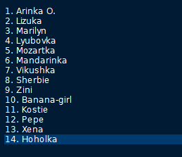 Криви, Гордей, Добоэ, Дзепка, Мячик, Ильичева, Кирсанова, Куличок, Парамонова, Дикая, Титуля, Андрейчик, Подлейшая, Жиля2, Козя, Костылек, Лукашик, Мильты, Пряник, Чесночок, Федот, Беляш, Вадяш, Ефременко, Лукин, Лазарев, Сарновские
