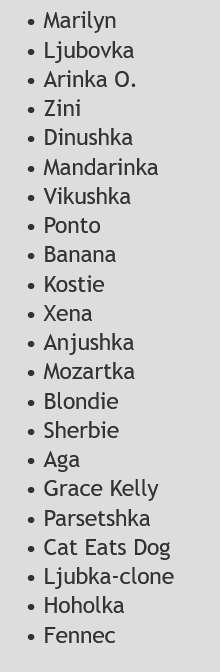 Ветлуга, Ероха, Кончук, Срухин, Федоров, Горби, Жиля, Захарова, Парамон, Петруха, Акопова, Юлюка, Зайка, Хабиб