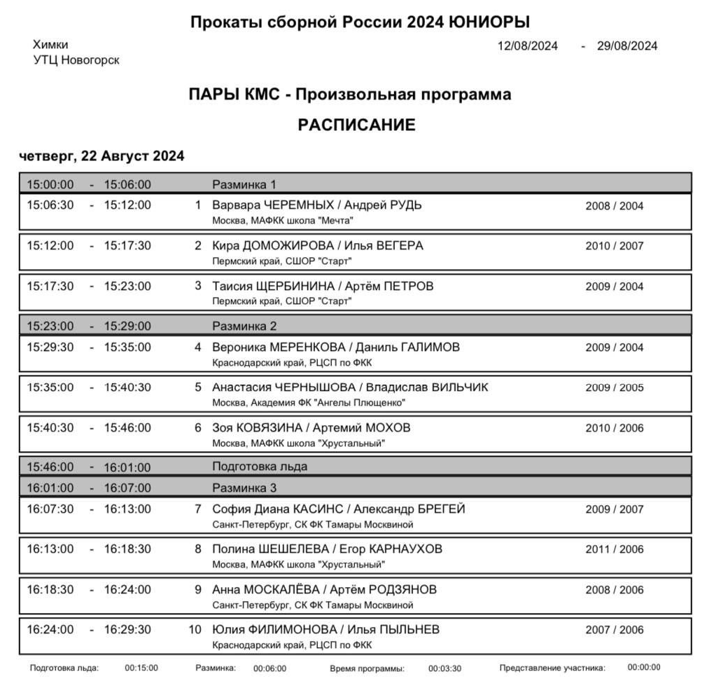 Ближайшие соревнования - контрольные прокаты юниоров с 14 августа - инфа тут https://fsrussia.ru/novosti-federatsii/novosti-federatsii/kontrolnye-prokaty-yuniorskoj-sbornoj-komandy-24#19-22-avgusta-parnoe-katanie