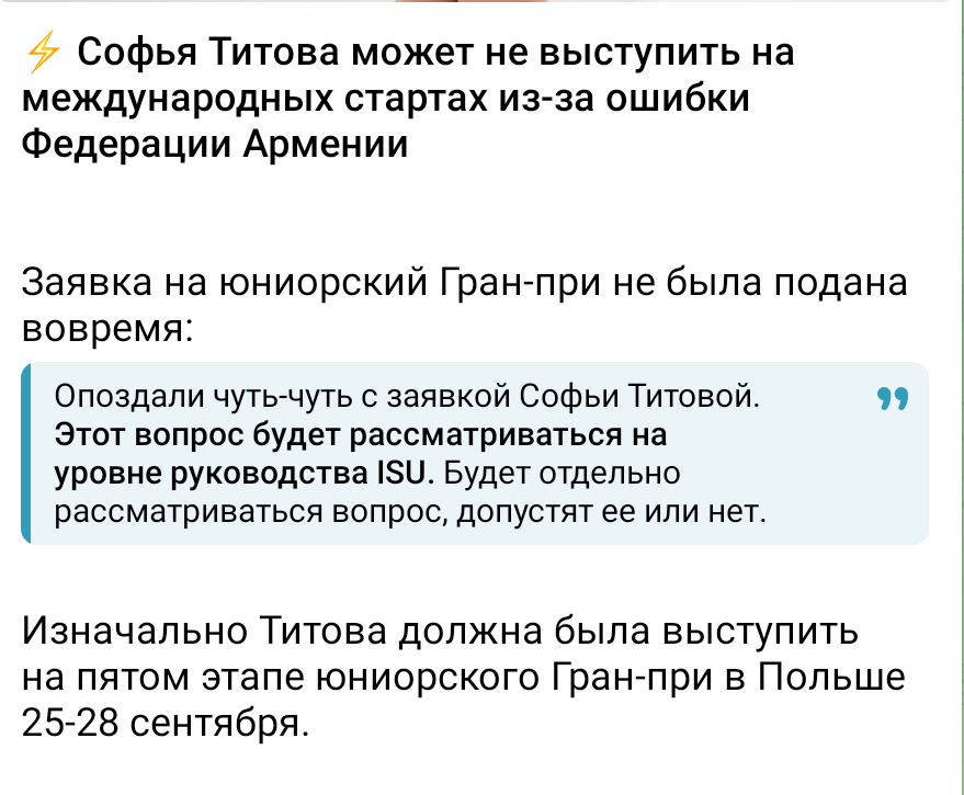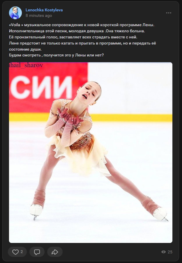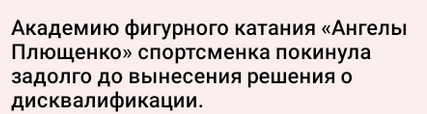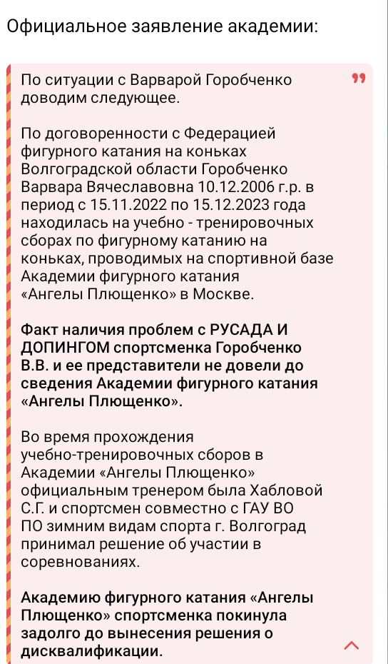 Мы числились в Волгограде, в Школе по зимним видам спорта, нашим официальным тренером была Светлана Хаблова. В «Ангелах Плющенко» мы были на сборах на коммерческой основе. Когда у нас забрали пробу — это произошло на соревнованиях на призы президента ФФКМ в апреле 2023 года — нам объяснили, что соревнования под эгидой федерации и государства для нас закрыты. В волгоградской школе нас перевели в платную группу на коммерцию, а в соревнованиях мы участвовали, в которых могли — не под эгидой ФФККР, там, где они проводятся на взносы. Поэтому я не могу понять, откуда такая шумиха на тему «Ангелов Плющенко». Мы туда впервые приехали в 2022 году, но приезжали наездами, месяц там — месяц здесь. Соревнования все были в Волгограде, мы туда ездили.