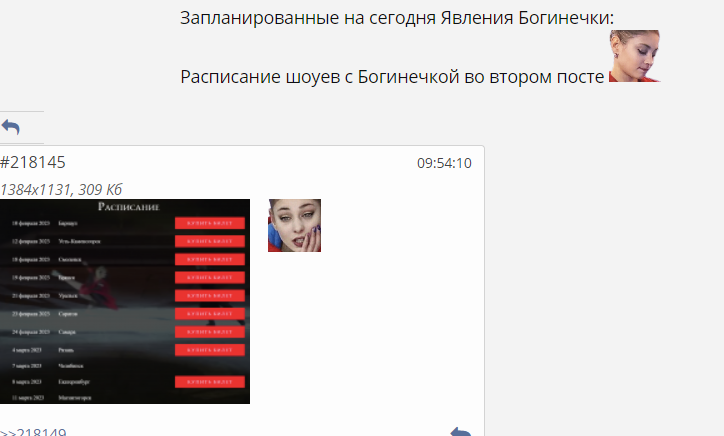 Расписание шоуев с Богинечкой во втором посте