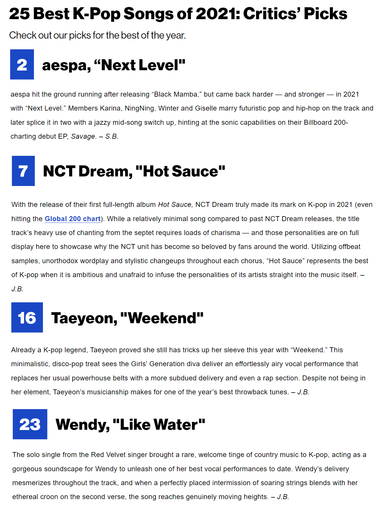 Список лучших песен 2021 года среди К-РОР артисток по мнению журнала «Teen Vogue»: