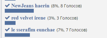 ive wooyoung(5%, 285 Голосов)Yena(5%, 279 Голосов)itzy lia (4%, 266 Голосов)itzy yuna (4%, 264 Голосов)ive rey (4%, 264 Голосов)NewJeans hanni (4%, 251 Голосов)NewJeans haerin (5%, 307 Голосов)red velvet irene (5%, 270 Голосов)le sserafim eunchae (5%, 288 Голосов)le sserafim eunchae(5%, 277 Голосов)le sserafim sakura (4%, 257 Голосов)jisoo (5%, 273 Голосов)nmixx sullyoon (4%, 259 Голосов)dreamcatcher jiu (4%, 256 Голосов)Oh My Girl arin (5%, 282 Голосов)winter aespa (4%, 240 Голосов)karina aespa (4%, 256 Голосов)gidle miyeon (4%, 255 Голосов)red velvet seulgi (5%, 272 Голосов)ive yujin (4%, 261 Голосов)