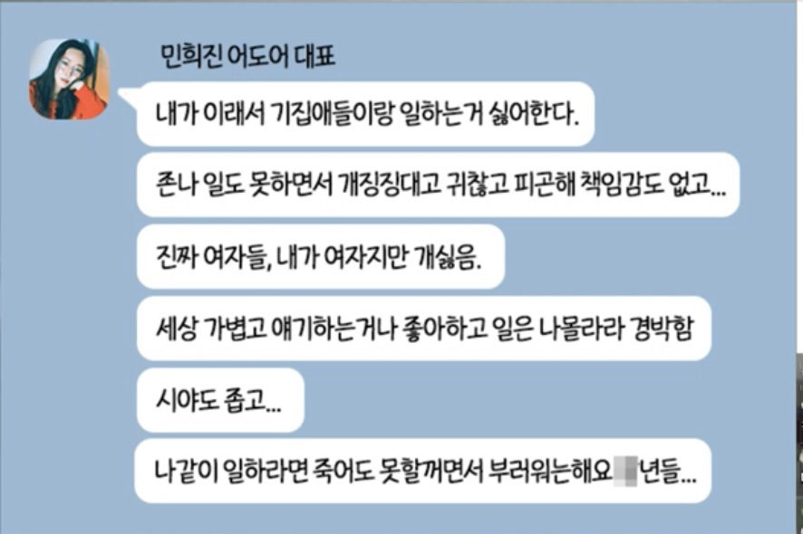 Во время слушаний HYBE утверждало, что материнский образ Мин Хиджин был лишь фасадом. Агентство утверждает, что Мин Хиджин ненавидела работать с NewJeans и неоднократно заявляла, что участницы группы психически слабы и не заслуживают обращения к ним как к артистам. Далее агентство утверждает, что Мин Хиджин подвергала участниц газовому газлайтингу и хотела, чтобы они были покорны ей.